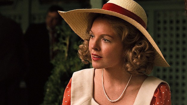 Kay was adorable at the wedding- brightly dressed in red, compared to the rest of the guests in black and the wedding party in peach. The time period was the 40’s, but her dress screamed 70s to me. I didn’t mind – I enjoyed how the costume designer brought in a bit of the current era. And I adored how Kay stuck out like a sore thumb in the wedding photo.