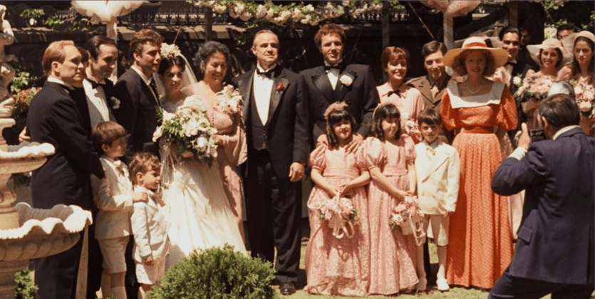 In the beginning, Micheal Corleone (youngest son out of 3) is identified as important to Don Vito when he refuses to take a family photo at his daughter’s wedding without his presence. When Michael eventually shows up with Kay by his side, the audience learns that he has distanced himself from his father’s family business. He is in a Marine Corp uniform, polished, and bright eyed. Kay gathers tidbits about Michael’s family as family members walk up to their. Kay is very curious and asks many questions.